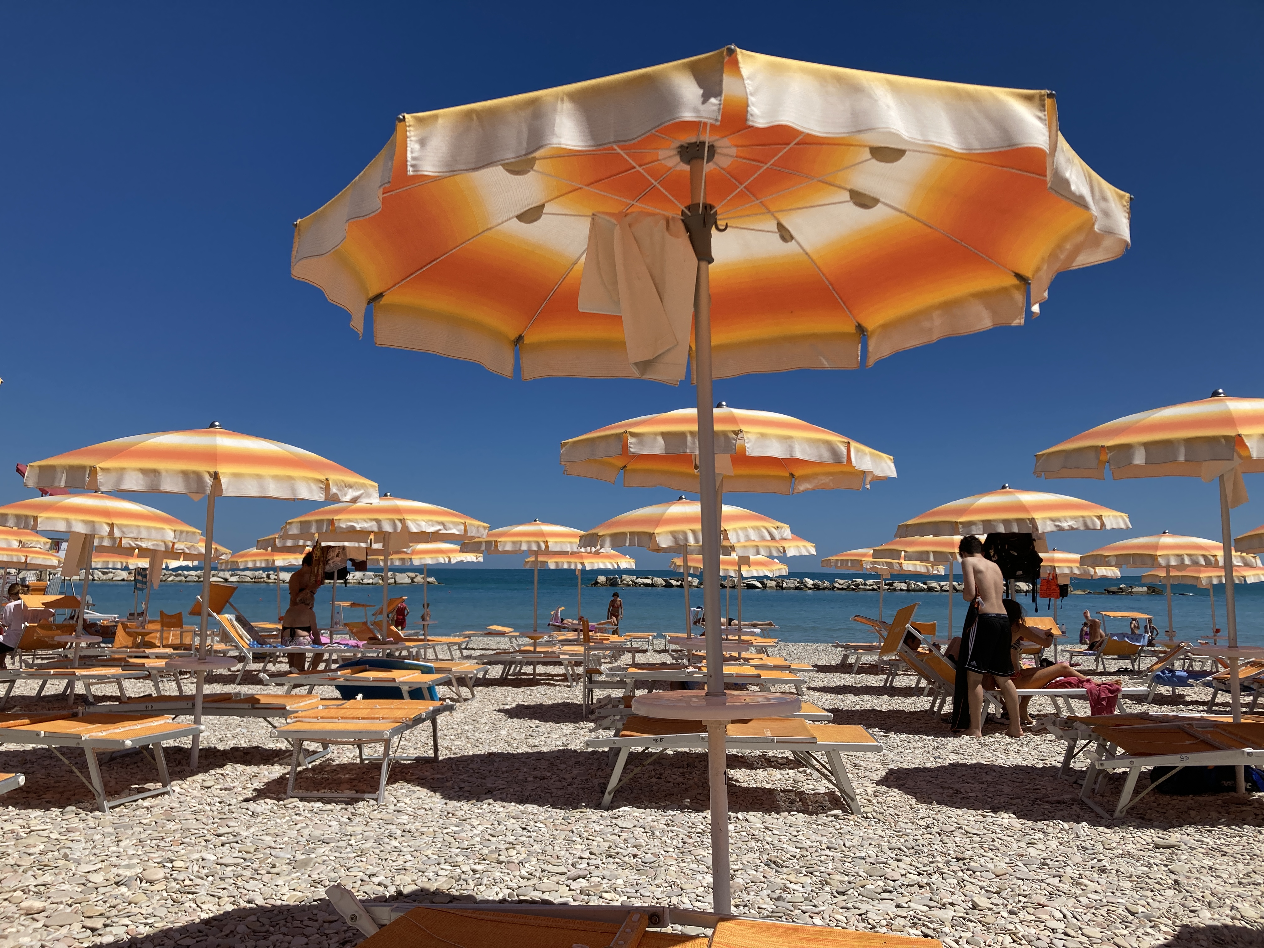 Pronounced Mar-kay, this is the area we were visiting for the wedding. Douglas booked our train tickets to Fano about a month in advance. Time-wise, the only train that worked with our schedule left Rome at 5:40am. After a brief layover in Ancona, with some of the BEST train station cappuccino, we arrived in Fano: a beach town full of locals and gorgeous beach clubs. We had a few hours to kill before a shuttle would take us to the wedding venue, and Douglas was determined to swim in the Adriatic Sea.